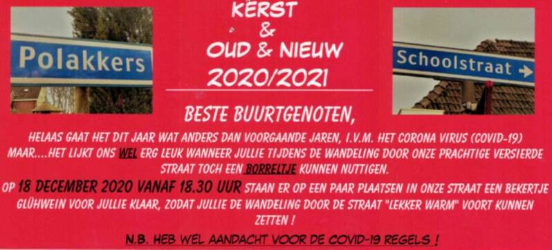 Er zijn dit jaar 2 kerstbomen geregeld welke zaterdag in de Polakkers worden geplaatst. Daarnaast werd de kerstborrel voor aanstaande maandag besproken en spontaan gepland. Een uitnodiging per brief volgt, maar informeer alvast uw buren.