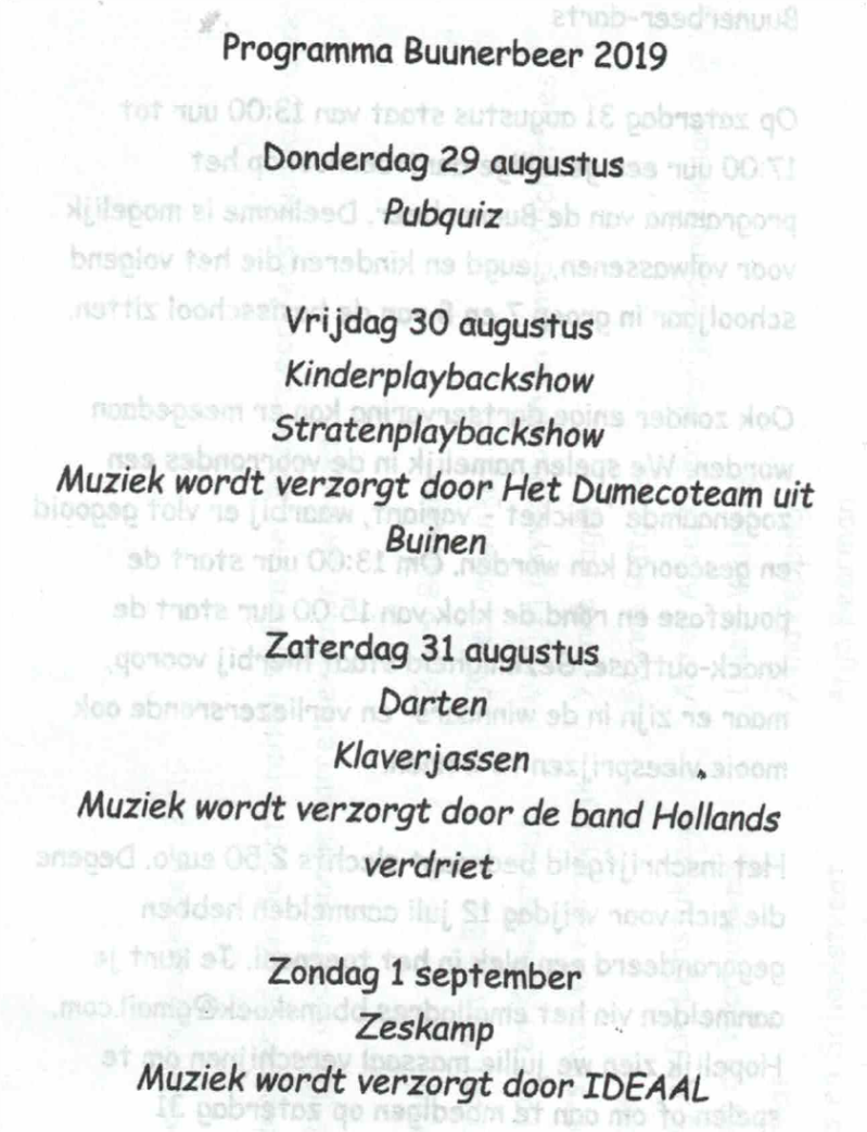 Voor het volleybal zijn 2 teams opgegeven, maar de spelers moeten nog wel worden vastgelegd vrijdag en denk voor de Buuner Beer ook alvast na over het thema voor de Straten Playback. De straat heeft iets hoog te houden !