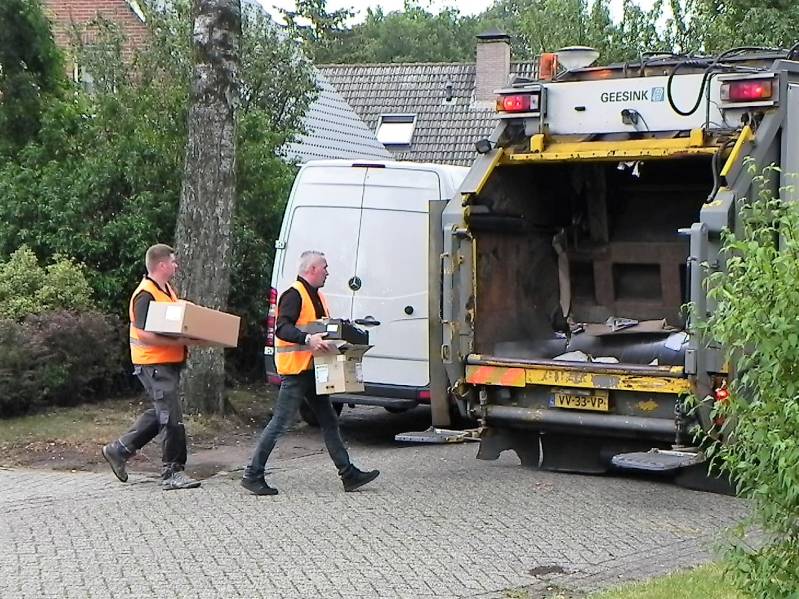 Om te garanderen dat het oud papier wel wordt opgehaald hebben we eigenlijk geen keuze en staan met de rug tegen de muur.